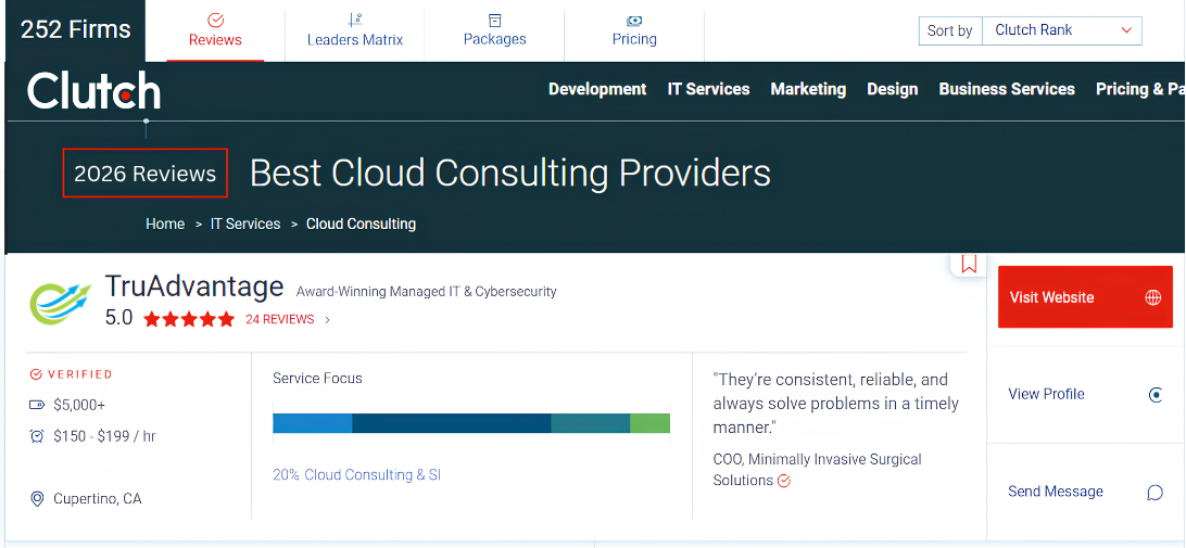 The cornerstone of Clutch’s independent research is “verified client interviews”. More than 10 of our clients validated TruAdvantage commitment to excellent customer service with 5-star reviews across the board. These Clients’ sizes range from 1 to 10, 10 to 50, and 200 plus.